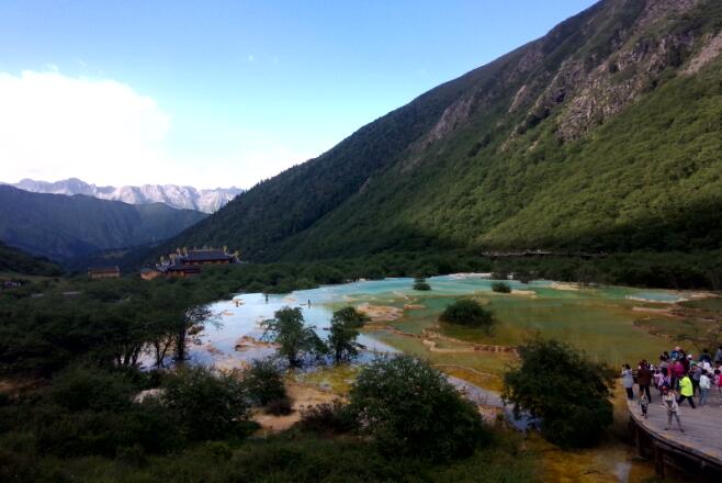 每個景點(diǎn)我們都留下來很多留戀的照片,保存這份珍貴的“童話之旅”。接下來的黃龍之旅又讓我們大開眼界,感嘆祖國的神奇山河,威武雄壯,或婀娜多姿。黃龍景區(qū),坐落在四川省松潘縣境內(nèi),是我國著名的風(fēng)景游覽區(qū),榮獲世界自然遺產(chǎn)、國家地質(zhì)公園、國家5A級旅游景區(qū)等等殊榮。占地4萬公頃,包括了本部黃龍溝、牟尼溝景區(qū)、紅星巖景區(qū)、雪寶頂景區(qū)、四溝景區(qū)及丹云峽景區(qū)。黃龍溝,是一條長7.5公里、寬1.5公里的由乳黃色巖石密布的緩坡溝谷。遠(yuǎn)遠(yuǎn)望去好似一條爬行于山谷叢林中的黃龍而得名。